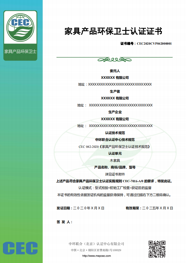 “家具產品環保衛士”認證證書由中環聯合(北京)認證中心(以下簡稱CEC)設計開發的“其他自愿性工業產品”認證,認證規則編號CEC7016-A0,依據標準編號: CTS CEC042-2020并由中國國家認證認可監督管理委員會批準備案,可在全國認證認可信息公共服務平臺查詢