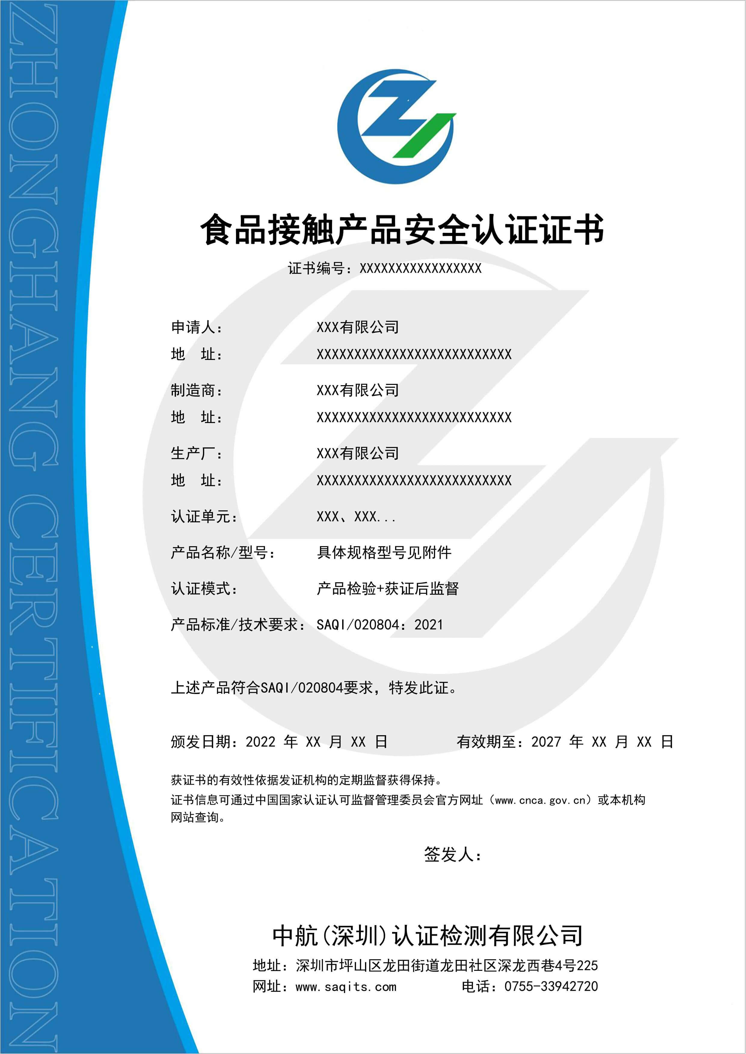 食品接觸產品安全認證證書:1.確保食品接觸產品的衛生標準,降低成本。。2.增強顧客的信心...查看更多>>